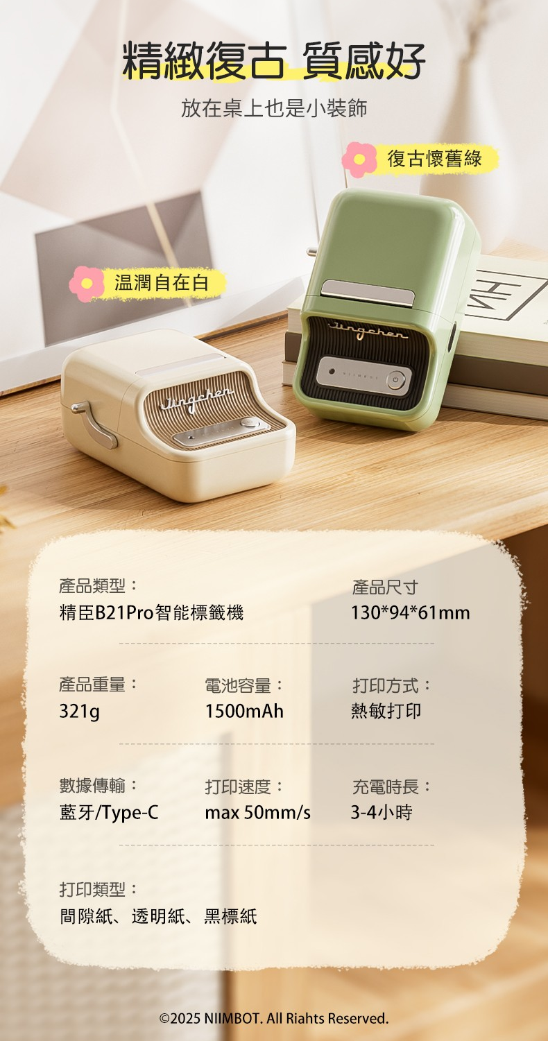 - 包裝內容 :B21Pro 標籤機主機 ×1原廠 充電線 ×1中文使用說明書 ×1