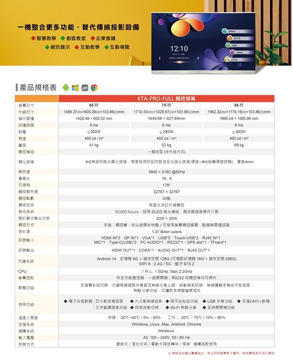 - 4K2K超清晰多點觸控螢幕,可以幫助教學效率大幅提升,企業展示更清楚表達產品和公司的優點,提升公司形象和業績的提升