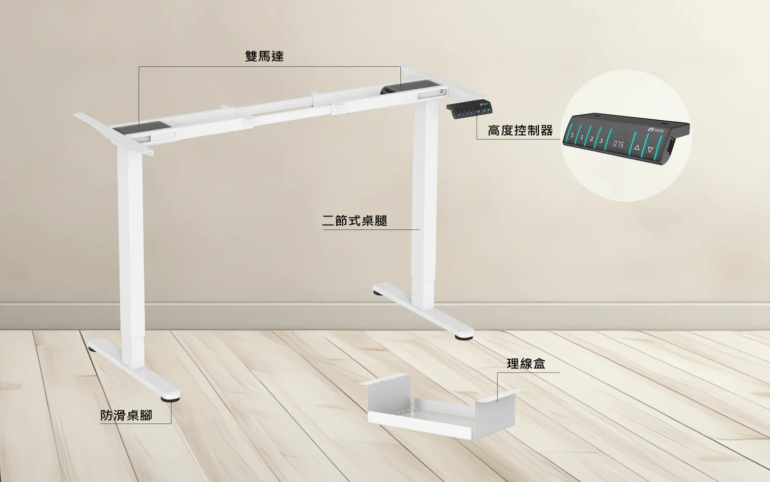 1. 雙馬達升降系統框體,性能優異的的馬達,承重力與驅動力強,可實現輕柔的高度調節與低噪音運轉,耐用且品質有保障
