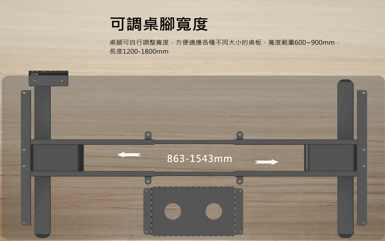 2. 可伸縮框架適用於多種桌面尺寸:可拉伸的框架可調整框體與桌腿距離,建議搭配長度1200mm~1800mm與寬度600mm~900mm的各式桌板
