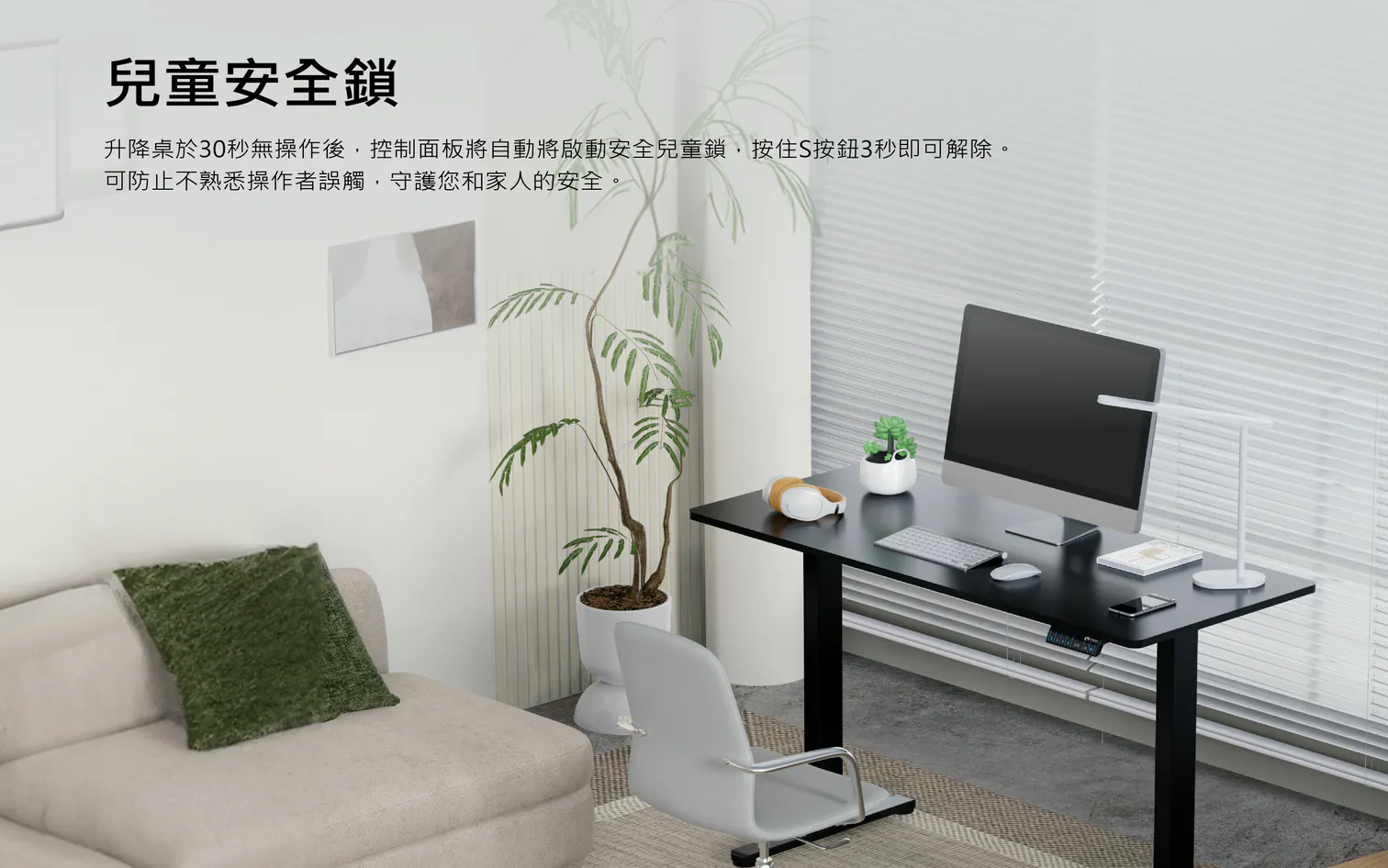 13. 符合歐美的安全規格,永遠自動開啟兒童安全鎖,可避免孩童誤觸造成傷害,也避免不熟悉升降桌的人錯誤操作,讓居家使用更安全與放心