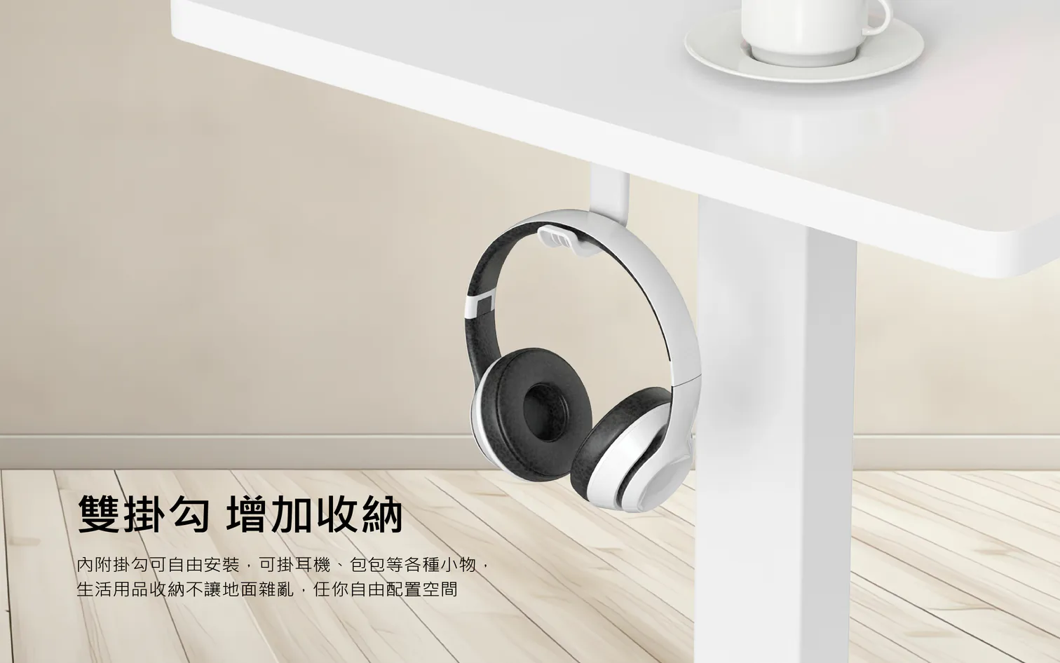 15. 附有兩個多功能掛勾,可自行安裝於桌板下,方便懸掛背包,公事包,耳機,雨傘,以及各種私人用品